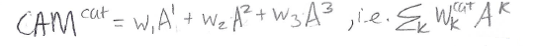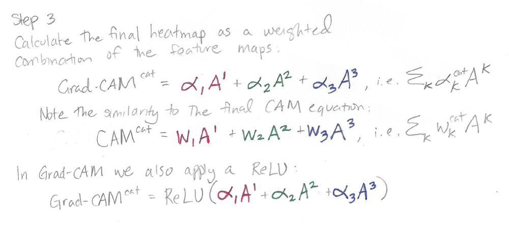 In the sketch above, the squares A1 (red), A2 (green), and A3 (blue) represent feature maps produced by the last convolutional layer of a CNN. To use the CAM method upon which Grad-CAM is based, we first take the average of each feature map to produce a single number per map. In this example we have 3 feature maps and therefore 3 numbers; the 3 numbers are shown as the tiny colored squares in the sketch. Then we apply a fully-connected layer to those 3 numbers obtain classification decisions. For the output class “cat” the prediction will be based on 3 weights (w1, w2, and w3). To make a CAM heatmap for “cat”, we perform a weighted sum of the feature maps, using the “cat” weights of the final fully-connected layer: