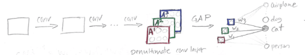 CAM requires an architecture that applies global average pooling (GAP) to the final convolutional feature maps, followed by a single fully connected layer that produces the predictions: