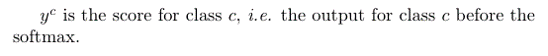 In other words, y^c is the raw output of the neural network for class c, before the softmax is applied to transform the raw score into a probability.