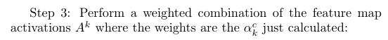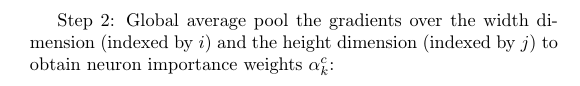 In this step, we calculate the alpha values. The alpha value for class c and feature map k is going to be used in the next step as a weight applied to the feature map A^k. (In CAM, the weight applied to the feature map A^k is the weight w_k in the final fully connected layer.)