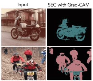 Part of Figure 4 of the Grad-CAM paper showing predicted motorcycle and person segmentation masks obtained by using Grad-CAM heatmaps as the seed for a method called SEC (Seed, Expand, Constrain)