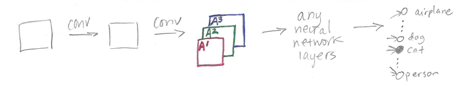 At this point, for CAM we would need to do global average pooling followed by a fully connected layer. For Grad-CAM, we can do anything – for example, multiple fully connected layers – which is shown as “any neural network layers” in the sketch. The only requirement is that the layers we insert after A1, A2, and A3 have to be differentiable so that we can get a gradient. Finally, we have our classification outputs for airplane, dog, cat, person, etc.