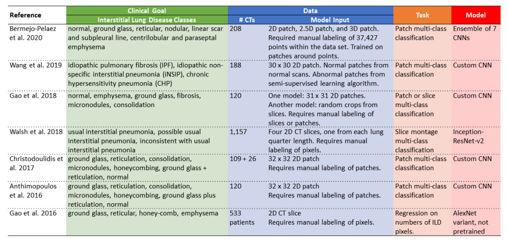 - Clinical goal: these papers are all focused on interstitial lung disease. The exact classes used differ between studies. Some studies focus on clinical groupings like idiopathic pulmonary fibrosis or idiopathic non-specific interstitial pneumonia (e.g. Wang et al. 2019 and Walsh et al. 2018). Other studies focus on lung patterns like reticulation or honeycombing (e.g. Anthimopoulos et al. 2016 and Gao et al. 2016).