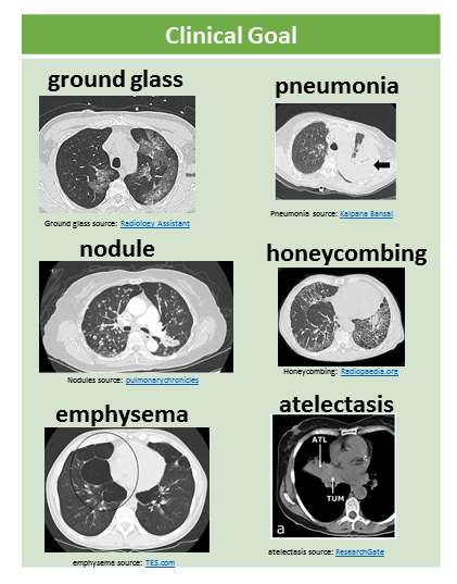 Image by Author. Sub-images from: ground glass Radiology Assistant, pneumonia Kalpana Bansal, nodules pulmonarychronicles, honeycombing Radiopaedia.org, emphysema TES.com, atelectasis ResearchGate
