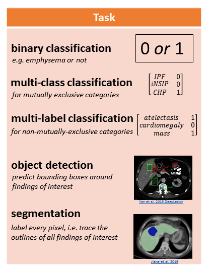 - Task: the tasks are mostly multi-class classification, in which each patch or slice is assigned to exactly one class out of multiple possible classes.