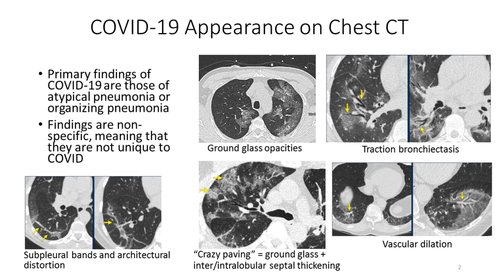 What does COVID-19 look like in a chest CT? The primary findings of COVID-19 are the findings of atypical pneumonia or organizing pneumonia. Such findings are non-specific, meaning that they are not unique to COVID-19 and can be seen in lung infections caused by bacteria or by other kinds of viruses.