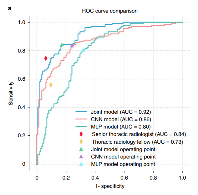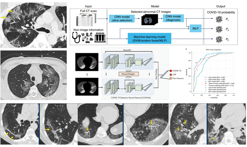 Results: The model combining CT and clinical data (joint model) had a 6% better AUROC than the model on CT data alone (P = 0.00146), and a 12% better AUROC than the model on clinical information alone (P < 1 × 10−4), showing that COVID-19 prediction was most effective when both CT data and other clinical data were used together. The authors also compared their algorithm to a senior thoracic radiologist, and found that “the algorithm performed equally well in sensitivity (P=0.05) in the diagnosis of COVID-19 as compared to a senior thoracic radiologist.”