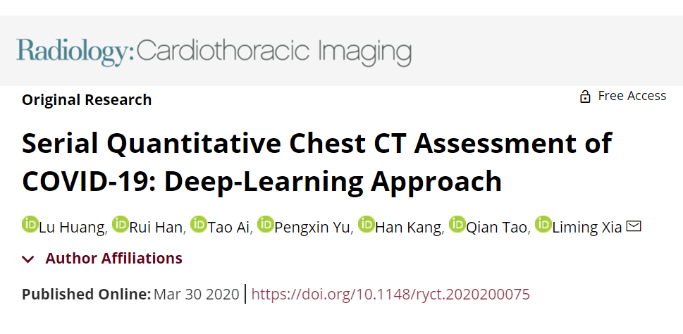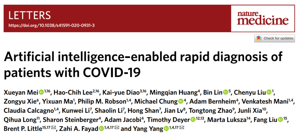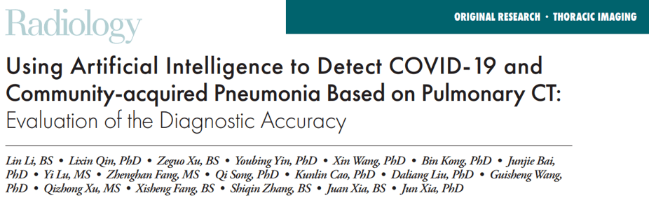 In this study, we used artificial intelligence (AI) algorithms to integrate chest CT findings with clinical symptoms, exposure history and laboratory testing to rapidly diagnose patients who are positive for COVID-19.