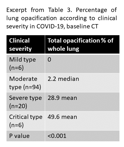 Huang et al. analyze 126 patients with differing severity of COVID-19 and investigate whether more clinically severe COVID-19 corresponds to quantitatively more lung opacification. COVID-19 diagnosis was confirmed with RT-PCR, and the patient’s clinical severity was measured using the “Diagnosis and Treatment Protocol of Novel Coronavirus” from the National Health Commission of China, which classifies patients into mild, moderate, severe, and critical:
