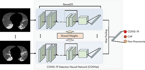 Here is an overall diagram of the “COVID-19 vs. CAP vs. non-pneumonia” model. Note that the U-Net preprocessing step is not explicitly shown: