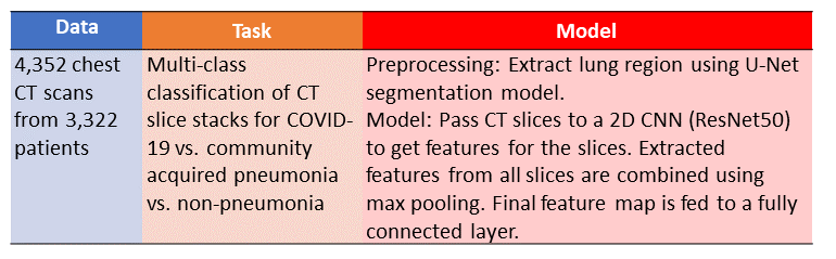 In this paper, the authors build and evaluate a model that takes a stack of CT slices as input, and predicts whether the scan shows COVID-19 pneumonia, community acquired pneumonia (“CAP”), or no pneumonia.