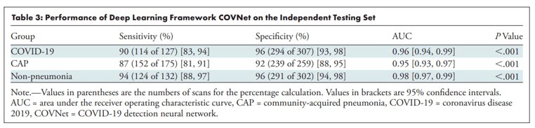 Results: The authors report good performance, with AUCs of 0.96, 0.95, and 0.98 for COVID-19, community-acquired pneumonia (CAP), and no pneumonia, respectively: