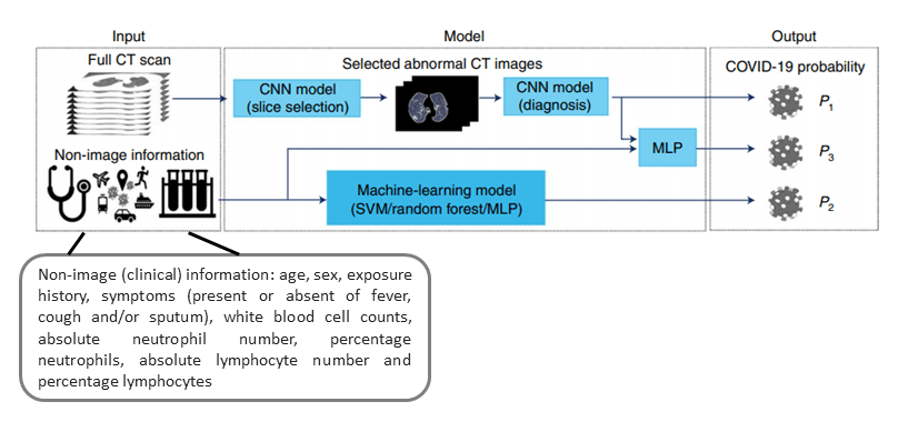 The model that combines chest CT data and clinical data involves feeding the output of the CT “diagnosis CNN” and the output of the clinical data model into a multilayer perceptron to produce the final prediction of COVID-19 status.