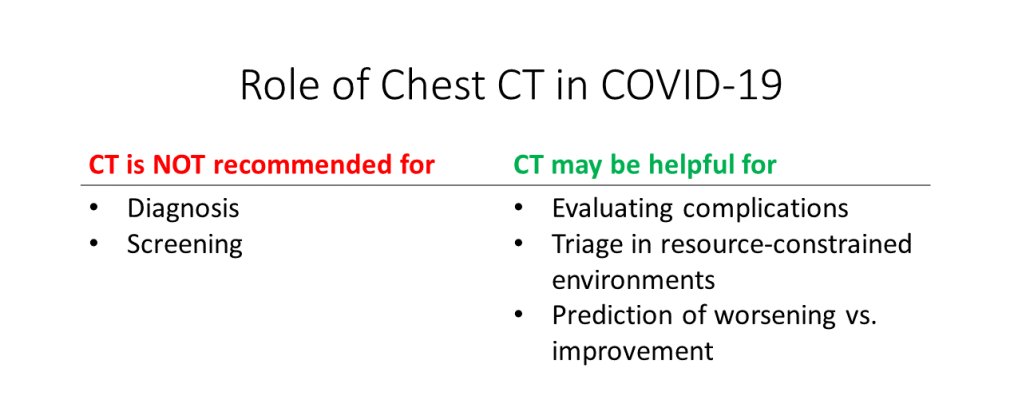 In summary, chest CT scans are NOT currently recommended for COVID-19 diagnosis or screening. However, chest CTs may be helpful for evaluating COVID-19 complications, triage in resource-constrained environments, or prediction of worsening vs. improvement: