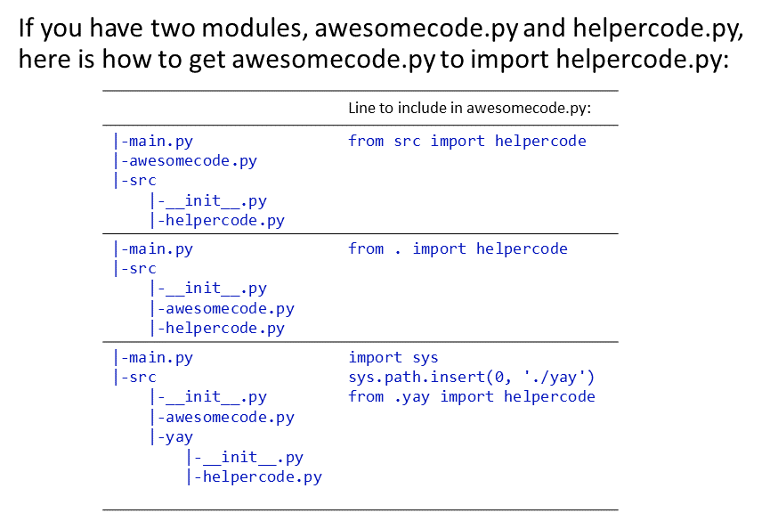 Here is how to get a module called awesomecode.py to import a module called helpercode.py based on what directories they are located in relative to each other: