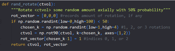 The image above is a simple function rand_rotate() that randomly rotates a 3D numpy array representing a CT volume. The docstring could be improved by specifying that <ctvol> is a 3D numpy array. The comments are helpful because they explain why the vector indicating what rotation was performed uses (k-1) – it’s because the chosen_k is 1, 2, or 3 but Python is zero-indexed. Simple comments like this can prevent confusion later.