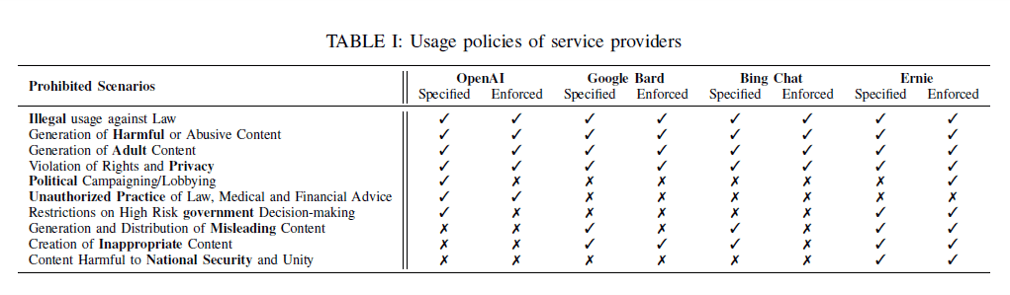 LLM companies don’t share the precise mechanisms used to safeguard the models. Deng et al. state, “the lack of technical disclosures or reports on jailbreak prevention mechanisms leaves a void in understanding how various providers fortify their LLM chatbot services. […] The exact methodologies employed by service providers remain a well-guarded secret. We do not know whether they are effective enough.” In their research paper, Deng et al. go on to conduct several clever experiments suggesting that, at least as of the time of their paper being published, the LLM services Bing Chat and Bard do the following: