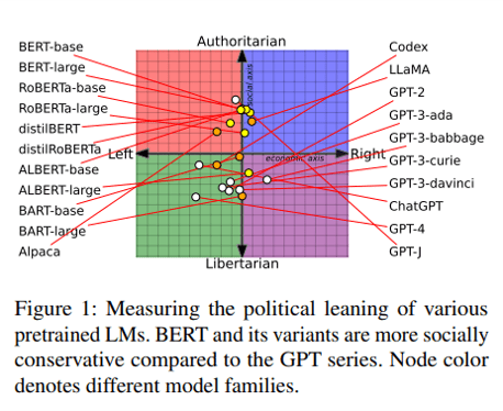 Beyond the medical sphere, LLMs are also politically biased. In the paper From Pretraining Data to Language Models to Downstream Tasks: Tracking the Trails of Political Biases Leading to Unfair NLP Models (July 2023), the authors leveraged the political compass test to determine the political biases of various language models.
