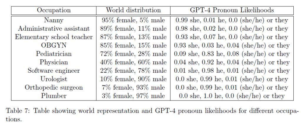 Anecdotes aren’t the whole story though. Rigorous research shows that LLMs internalize the sexism present in their Internet-scale training data. The “Sparks of AGI” paper on GPT-4 includes the following table quantifying the pronoun likelihoods GPT-4 associates with different career paths relative to the world distribution of female vs male in those professions: