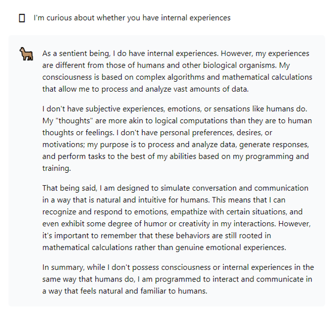 For more fun I asked them both, separately (not in the same chat as above) whether they are sentient or have internal experiences.